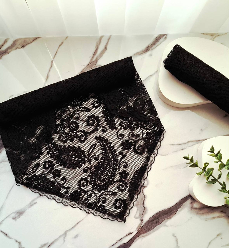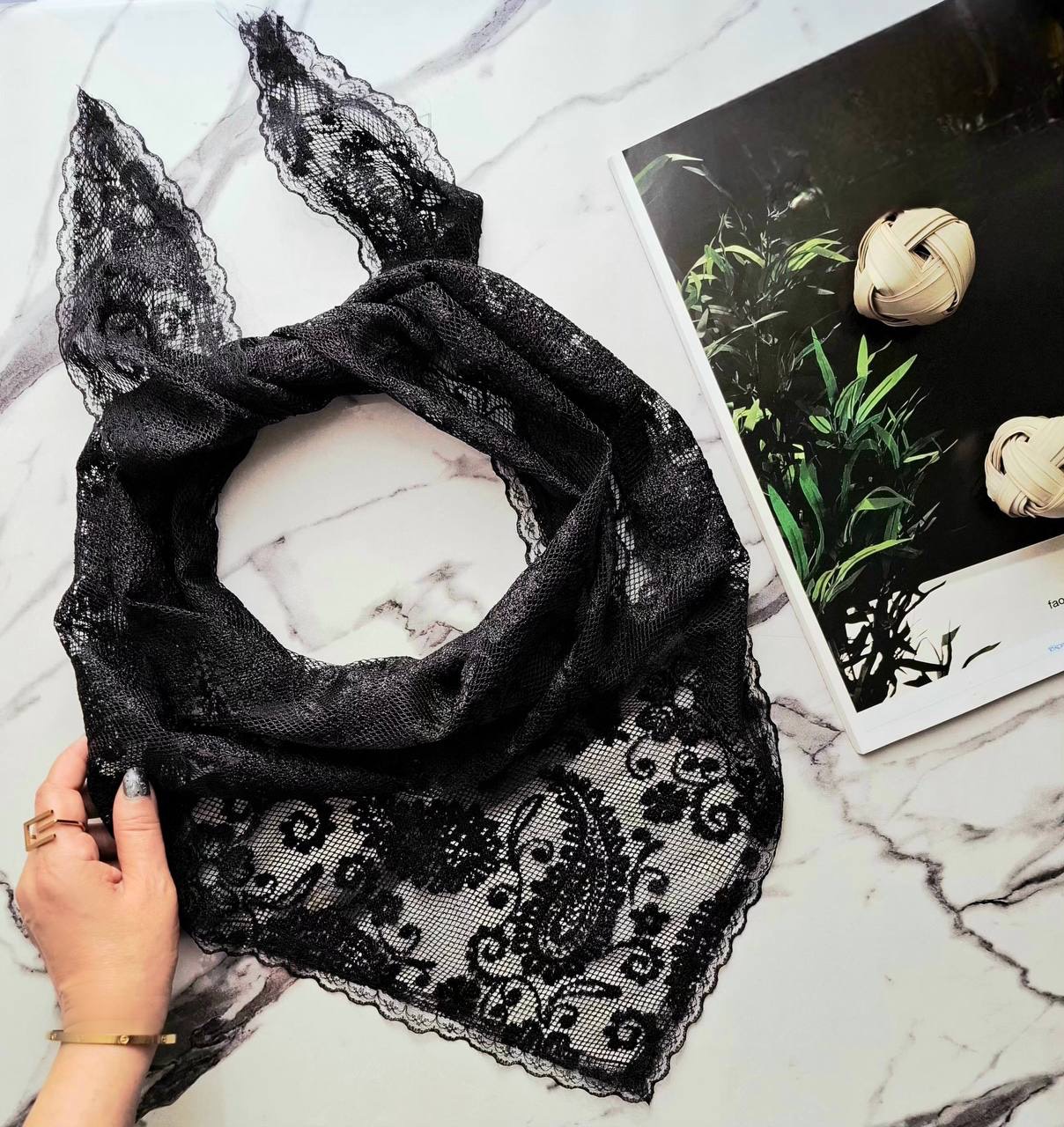 این روسری سه گوش با طراحی گیپور و تزئینات دانتل در دور کار، انتخابی شیک و جذاب برای تکمیل استایل شماست.
